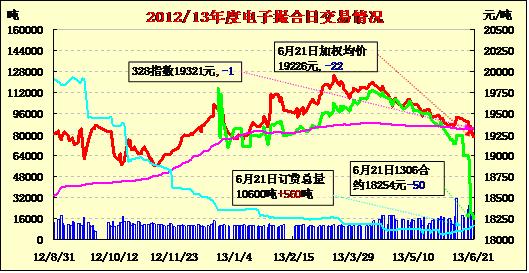 6月21日,商品棉交易多數(shù)合同低開,日內(nèi)震蕩下行,均價(jià)下跌。MA1306平均價(jià)18254跌50,MA1307平均價(jià)18650跌103,MA1308平均價(jià)18819跌132,MA1309平均價(jià)19157跌135,MA1310平均價(jià)19340跌74,MA1311平均價(jià)19420跌66。交易成交16780噸,較上一交易日減少3520噸。MA1307、MA1308和MA1309分別較前一交易日成交縮減1500噸、1680噸和1320噸;MA1306、MA1310和MA1311成交分別較前一交易日增加160噸、260噸和560噸。訂貨量增加560噸,累計(jì)訂貨量10600噸。 各合同訂貨量均有增加,數(shù)量為20-280噸不等。