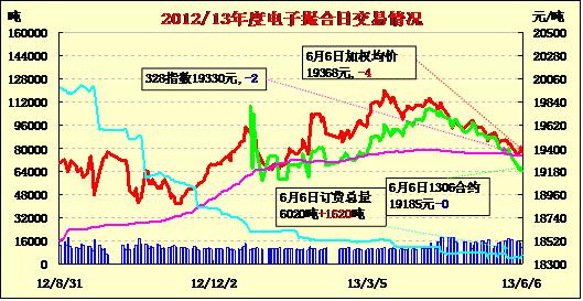 6月6日,商品棉交易各合同均高開,日內(nèi)窄幅震蕩,均價(jià)近跌遠(yuǎn)漲。其中,MA1307合同、MA1308合同和MA1309合同均價(jià)較昨日分別下跌60元/噸、38元/噸和23元/噸;MA1310合同和MA1311合同均價(jià)較昨日分別上漲25元/噸和21元/噸。交易總成交11420噸,較上一交易日減少2720噸。MA1306合同無交易,除MA1308合同成交量較昨日有所增加外,其余合同均較昨日成交量縮減。訂貨量增加1620噸,累計(jì)訂貨6020噸。MA1308合同增倉1320噸,MA1307和MA1309合同分別小增200噸和100噸,其余合同訂貨量不變。