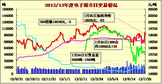 7月25日,商品棉交易各合同開盤高低互現(xiàn),日內(nèi)寬幅震蕩,均價漲跌不一。MA1308平均價18850漲39,MA1309平均價19050不變,MA1311平均價19632漲18,MA1311平均價19632漲18,MA1312均價19631漲5,MA1401均價19636漲22。交易成交12640噸,較上一交易日減少880噸。MA1308和MA1309兩份合同成交極為清淡。MA1401成交1600噸。MA1310、MA1311和MA1312分別成交3000噸、3000噸和4720噸。訂貨量減少1840噸,累計訂貨量8460噸。MA1310和MA1311訂貨量繼續(xù)大減,分別較少1540噸和600噸,其余合同訂貨量變化不大。