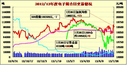 7月26日,商品棉交易各合同開盤高低互現(xiàn),日內寬幅震蕩,均價漲跌互現(xiàn)。MA1308平均價18850不變,MA1309平均價19226漲176,MA1310平均價19371漲72,MA1311平均價19634漲2,MA1312均價19627跌4,MA1401均價19636不變。交易成交11300噸,較上一交易日減少1340噸。MA1308無成交,MA1309和MA1310均成交420噸。MA13011成交2700噸,MA1312成交4220噸,MA1401成交3540噸。成交集中遠月,總成交較低迷。訂貨量增加260噸,累計訂貨量8720噸。MA1310和MA1311訂貨量分別增加4200噸和400噸,MA1311訂貨量增1080噸,其余合同訂貨量不變。