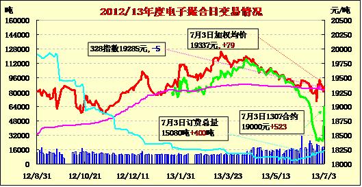 7月3日,商品棉交易合同開盤高低互現(xiàn),日內(nèi)寬幅震蕩,均價(jià)近漲遠(yuǎn)跌。MA1307平均價(jià)19000漲523,MA1308平均價(jià)18614漲不變,MA1309平均價(jià)19158漲27,MA1310平均價(jià)19288漲43,MA1311平均價(jià)19573跌2,MA1312均價(jià)19556跌28。交易成交19300噸,較上一交易日增620噸。MA1307成交20噸,MA1308無成交,MA1309成交增加,成交8640噸,為主要成交合同。MA1310、MA1311和MA1312分別成交3180噸、4620噸和2840噸,成交小幅減少。訂貨量增加400噸,累計(jì)訂貨量15080噸。MA1310和MA1311訂貨量分別增加120噸和280噸。其余合同訂貨量不變。近月MA1307訂貨2080噸,MA1309和MA1310為主要訂貨合同,分別訂貨4240噸和5100噸。