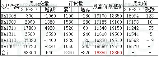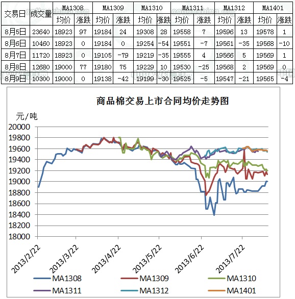 當(dāng)周商品棉交易有以下特點(diǎn):一、成交仍舊以遠(yuǎn)月合同為主,近月成交延續(xù)清淡之勢。當(dāng)周MA1312為主要成交合同,成交27380噸。MA1401和MA1310分別成交16720噸和17880噸。其余合同成交清淡,其中近月僅成交300噸。二、訂貨量減少,訂貨總量仍舊較少。當(dāng)周整體來看,近月訂貨量小幅減少,遠(yuǎn)月合同訂貨量小幅增加,總的來看,訂貨量變化不大。三、均價近漲遠(yuǎn)跌,當(dāng)周近月MA1308和MA1309合同分別漲128元/噸和10元/噸,其余合同跌1-55元/噸不等。