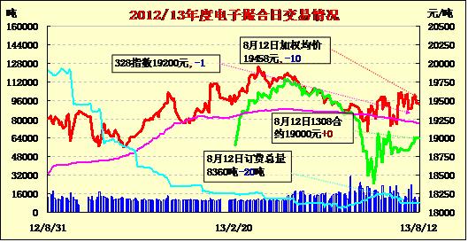 8月12日,商品棉交易各合同開盤高低不一,日內(nèi)窄幅震蕩,均價近漲遠(yuǎn)跌。MA1308平均價19000不變,MA1309平均價19141漲3,MA1310平均價19221漲22,MA1311平均價19507跌18,MA1312均價19537跌10,MA1401均價19553跌12。交易成交12540噸,較上一交易日減少2240噸。近月無成交,MA1312為成交主力,其余合同成交清淡。MA1312成交5720噸,為成交主力。其余合同成交較為清淡。訂貨量微幅減少20噸,累計訂貨量8360噸。MA1311訂貨量減少20噸,其余合同訂貨量不變。目前近月MA1308訂貨1100噸。MA1311訂貨1880噸,訂貨量最大。