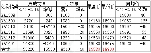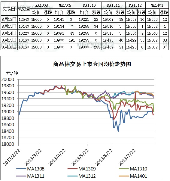 當(dāng)周商品棉交易有以下特點(diǎn):一、近月合同無成交,成交仍舊以遠(yuǎn)月合同為主。當(dāng)周MA1312為主要成交合同,成交21900噸。MA1401和MA1311分別成交14880噸和11590噸。其余合同成交極為清淡清淡。二、訂貨量變化不大。當(dāng)周整體來看,訂貨量變化不大,目前最大的訂貨合同為MA1311,訂貨1880噸。近月MA1308訂貨1100噸。三、多數(shù)合同周均價(jià)下跌。當(dāng)周除了MA1308周均價(jià)上漲46元/噸外,其余合同周均價(jià)均下跌,其中MA1309跌125元/噸,其他合同跌45-53元/噸不等。
