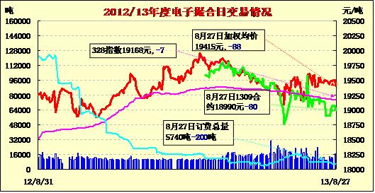 8月27日,商品棉交易各合同開盤高低不一,日內(nèi)窄幅震蕩,均價全線收跌。MA1309平均價18990跌80,MA1310平均價18800跌19,MA1311平均價19257跌154,MA1312均價19507跌41,MA1401均價19510跌54,MA1402平均價19519跌16。成交量增加。交易成交16860噸,較上一交易日增500噸。遠月三份合同交投延續(xù)活躍態(tài)勢,近月合同中MA1310合同交投亦較昨日有所放大。訂貨量減200噸,累計訂貨5740噸。MA1309合同和MA1312合同分別小幅減持40噸和180噸。遠月MA1402訂貨量增加20噸。