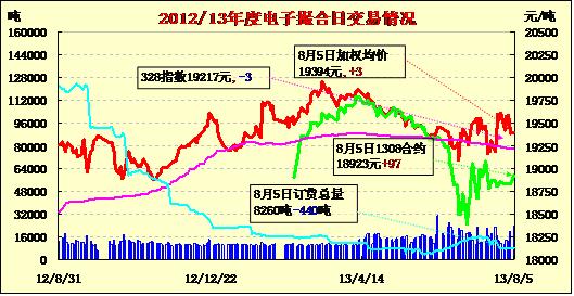 8月5日,商品棉交易各合同高開,日內寬幅震蕩,均價上漲。MA1308平均價18923漲97,MA1309平均價19184漲24,MA1310平均價19308漲28,MA1311平均價19558漲7,MA1312均價19596漲13,MA1401均價19578漲1。成交23640噸,較上一交易日增加12240噸。MA1310今日成交13320噸,為主要成交合同。MA1312成交5240噸,其余合同成交清淡。訂貨量減440噸,累計訂貨量8260噸。MA1308和MA1312合同訂貨量分別減少60噸和380噸,其余合同訂貨量不變。目前近月合同僅訂貨1320噸。