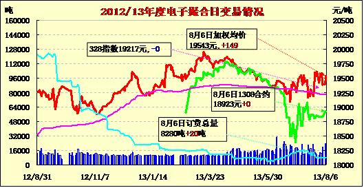 8月6日,商品棉交易各合同開(kāi)盤(pán)高低不一,走勢(shì)震蕩幅度不大,均價(jià)上漲。MA1308平均價(jià)18923 不變,MA1309平均價(jià)19184不變,MA1310平均價(jià)19254跌54,MA1311平均價(jià)19551跌7,MA1312均價(jià)19561跌35,MA1401均價(jià)19568跌10。交易成交10460噸,較上一交易日減少13180噸。近月成交極為清淡,遠(yuǎn)月為成交主力,MA1312和MA1401分別成交5160噸和4080噸。其余合同成交極為清淡。訂貨量增20噸,累計(jì)訂貨量8280噸。MA1311訂貨量減少240噸,MA1401訂貨量增加260噸,其余合同訂貨量不變。目前近月合同僅訂貨1320噸。