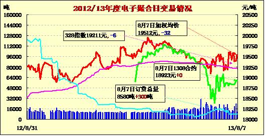 8月7日,商品棉交易各合同開盤高低不一,經(jīng)歷早盤震蕩走勢(shì)后,午后走勢(shì)平穩(wěn),終盤近跌遠(yuǎn)漲。MA1308平均價(jià)18923 不變,MA1309平均價(jià)19105跌79,MA1310平均價(jià)19219跌35,MA1311平均價(jià)19555漲4,MA1312均價(jià)19566漲5,MA1401均價(jià)19569漲1。交易成交11720噸,較上一交易日增1080噸。MA1312為成交主力,其余合同成交清淡,MA1312成交6760噸,為成交主力,MA1401成交2020噸,其余合同成交極為清淡,其中近月MA1308今日無(wú)成交。訂貨量增300噸,累計(jì)訂貨量8580噸。MA1309訂貨量減少240噸,MA1312訂貨量增加480噸,其余合同訂貨量變化不大。