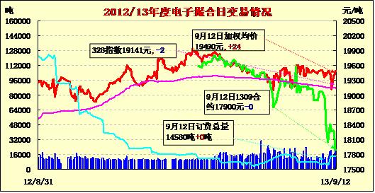 9月12日,商品棉交易多數(shù)合同高開(kāi),日內(nèi)寬幅震蕩,近月價(jià)格不變,其余合同多數(shù)上漲。MA1309平均價(jià)17900不變,MA1310平均價(jià)18000不變,MA1311平均價(jià)19466漲64,MA1312均價(jià)19545漲27,MA1401均價(jià)19534漲19,MA1402平均價(jià)19392跌1。成交23780噸,較上一交易日增3960噸。MA1309和MA1310今日無(wú)成交。MA1312成交7780噸,為主要成交合同。其余合同成交4020-6000噸。訂貨量增不變,累計(jì)訂貨14580噸。