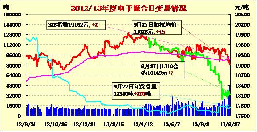9月27日,商品棉交易各合同開盤高低不一,終盤近漲遠(yuǎn)跌。MA1310平均價(jià)18145漲7,MA1311平均價(jià)19095漲2,MA1312均價(jià)19086漲45,MA1401均價(jià)19085漲35,MA1402平均價(jià)18935跌47,MA1403均價(jià)18830跌170。交易成交17840噸,較上一交易日減少12420噸。MA1312、MA1401和MA1402分別成交5300噸、5280噸和4160噸。其余成交較為清淡。訂貨量增加200噸,累計(jì)訂貨12640噸。主要訂貨合同為MA1401,訂貨8820噸。近月MA1310合同訂貨1060噸。