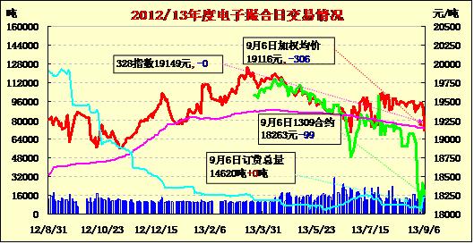 9月6日,商品棉交易多數(shù)合同低開,寬幅震蕩,均價(jià)下跌。MA1309平均價(jià)18263跌99,MA1310平均價(jià)18462跌102,MA1311平均價(jià)19339跌20,MA1312均價(jià)19509跌26,MA1401均價(jià)19528跌59,MA1402平均價(jià)19415跌75。交易成交17500噸,較上一交易日增3280噸。近月MA1309成交4820噸,成交大幅增加。MA1312和MA1402成交也相對(duì)較好,分別成交4200噸和5360噸。其余合同成交1280—2880噸不等。訂貨量不變,累計(jì)訂貨14620噸。