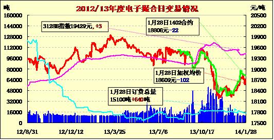 1月28日,商品棉交易各合同開盤高低不一,多數(shù)收跌。MA1402合同平均價(jià)18806元/噸,跌22元,MA1403合同平均價(jià)18854元/噸,MA1404合同平均價(jià)18528元/噸,分別漲29和40元;MA1405合同平均價(jià)18396元/噸,MA1406合同平均價(jià)18467元/噸,MA1407合同平均價(jià)18450元/噸,分別下跌17、43和10元。交易成交10600噸,較上一交易日增加380噸。訂貨量增加640,累計(jì)訂貨14100噸。