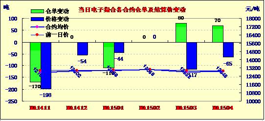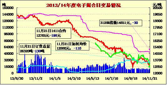 11月21日撮合交易成交10080噸,較上一交日增加3210噸。訂貨量減少130噸,累計訂貨26320噸。交易合同全線低開,盤中震蕩走低,均價續(xù)跌。當(dāng)日成交增加,無特別活躍合同,MA1501和MA1504分別成交3860噸3030噸,為本周主要成交合同,其余合同成交低迷。訂貨量減少,當(dāng)日MA1411和MA1501訂貨量分別減少170噸和110噸,MA1503和MA1504訂貨量分別增加80噸和70噸,其余合同訂貨量無變化。當(dāng)前MA1501為主要訂貨合同,訂貨11000噸。