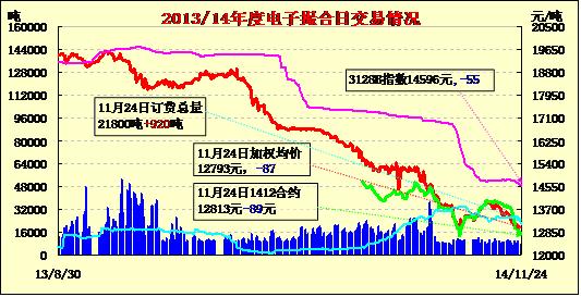 11月25日,電子撮合交易成交8540噸,較上一交日增加1310噸。訂貨量減少720噸,累計訂貨21080噸。各合同開盤高低不一,盤中震蕩走勢,均價漲跌不一。當日成交縮減,無特別活躍合同,近月僅成交120噸,其余合同成交1280—2040噸不等。訂貨量減少,當日MA1412、MA1501、MA1503和MA1504訂貨量分別減少120噸、270噸、120噸和250噸,其余合同訂貨量變化不大。當前MA1501為主要訂貨合同,訂貨11010噸。