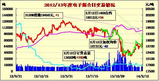 2月12日,商品棉交易市場商品棉交易成交11080噸,較上一交易日增800噸??傮w成交清淡,MA1402和MA1403成交不足500噸。其余合同成交2160—3200噸。訂貨量增加780噸,累計訂貨13820噸。MA1404和MA1405訂貨量分別增加200噸和640噸,MA1402訂貨量減少20噸,其余合同訂貨量不變。目前MA1403為主要訂貨合同,訂貨9980噸。今日商品棉交易各合同高開,日內寬幅震蕩,均價續(xù)漲。
