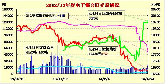 4月24日全國棉花交易市場商品棉交易成交20020噸,較上一交易日增加6870噸。今日訂貨量減140噸,累計訂貨4420噸。今日商品棉交易各合同開盤高低不一,日內(nèi)寬幅震動,均價近漲遠跌。棉花現(xiàn)貨市場延續(xù)弱勢,國儲棉轉(zhuǎn)讓疆棉2降3級,內(nèi)地庫銷售價格在18000-18200元/噸水平;清關(guān)外棉報價持穩(wěn),但目前港上貨不多。保稅外棉價格仍維持高位,近期少有成交;棉紗市場仍維持弱勢,市場氛圍偏空。