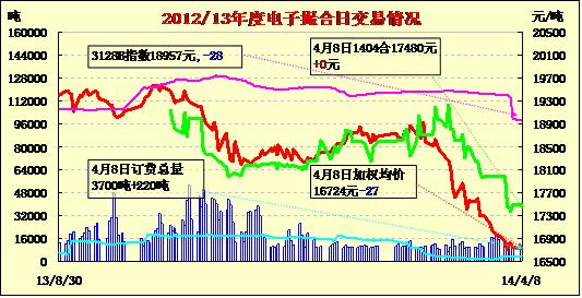 4月8日全國棉花交易市場商品棉交易成交10040噸,較上一交易日減少40噸。訂貨量增220噸,累計訂貨3700噸。今日商品棉交易各合同開盤高低不一,日內(nèi)寬幅震蕩,均價漲跌不一。5日,經(jīng)國務院批準,國家發(fā)展改革委、財政部、農(nóng)業(yè)部聯(lián)合發(fā)布2014年棉花目標價格,為每噸19800元;近來的紗線市場行情基本仍難以改觀,一直呈現(xiàn)平淡無力的狀態(tài),價格和銷售難以有明顯轉(zhuǎn)變;港口人民幣現(xiàn)貨仍有一定走貨,美金船貨銷售成交仍清淡。