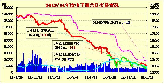 1月23日電子撮合交易成交10140噸,較上一交日增加2270噸。訂貨量增加100噸,累計訂貨10770噸。交易各合同開盤高低不一,日內(nèi)延續(xù)整理之勢,均價漲跌不一。目前,新疆棉成交乏力狀況難有改善,由于軋花廠資金鏈普遍緊張,近期出貨熱情仍然較高,但春節(jié)前下游補庫計劃大多難以改變,按需采購下順價出貨收效甚微。由于下降手采棉成本偏高,加上運費等后高出內(nèi)地1000元/噸以上,而內(nèi)地紡織廠使用地產(chǎn)棉、進口棉替代現(xiàn)象比較常見。