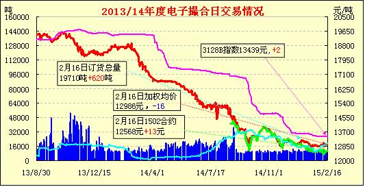 2月16日電子撮合交易成交7970噸,較上一交日減少2240噸。訂貨量增加620噸,累計(jì)訂貨19710噸。交易各合同多數(shù)高開,日內(nèi)震蕩整理,均價(jià)多數(shù)上漲。春節(jié)臨近公檢速度放緩, 截至2015年2月15日內(nèi)地已達(dá)近85萬噸。