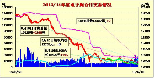 6月10日電子撮合交易成交21540噸,較上一交易日增加5740噸。訂貨量增加2190噸,累計訂貨17540噸。交易各合同開盤高低不一,日內(nèi)窄幅整理,均價近漲遠跌。全棉紗市場繼續(xù)弱勢調(diào)整,多數(shù)紡企降低原料及產(chǎn)品庫存,為年中現(xiàn)金流減少壓力。目前整體市場較為看空,特別是高支精梳紗需求轉(zhuǎn)淡較為明顯,庫存上升。
