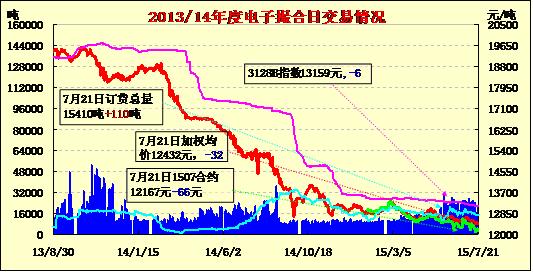 7月21日電子撮合交易成交20190噸,較上一交易日增加5280噸。訂貨量增加110噸,累計(jì)訂貨15410噸。交易各合同開盤高低不一,盤中震蕩走低,均價(jià)下跌。棉花現(xiàn)貨市場弱勢,內(nèi)地庫好質(zhì)量疆棉尋貨不易,本年度棉花現(xiàn)貨所剩不多,價(jià)格基本圍繞輪出價(jià)格;近期新疆遭遇罕見高溫,局地高達(dá)45攝氏度,連日的“炙烤”天氣,對棉花生長也有一定的影響。