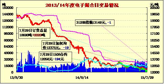 7月29日電子撮合交易成交18610噸,較上一交易日減少980噸。訂貨量增加2020噸,累計(jì)訂貨18690噸。交易各合同開盤高低不一,盤中震蕩下行,均價下跌。今年目前棉花長勢普遍較去年稍好,早熟品種可能會提前1-2周采摘。北疆地區(qū)受大風(fēng)降雨天氣影響播種較遲,采摘時間大概在9月中上旬左右,南疆地區(qū)采摘時間或在8月中下旬左右。