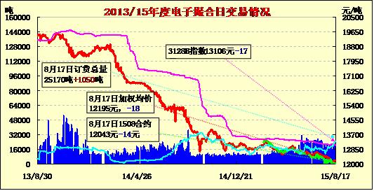 8月17日棉花撮合交易成交16590噸,較上一交易日減少750噸。訂貨量增加1050噸,累計(jì)訂貨25170噸。交易各合同開盤高低不一,盤中窄幅震蕩,均價(jià)漲跌互現(xiàn)。當(dāng)日儲(chǔ)備棉輪出成交1175噸,兵團(tuán)成交1083噸,商品棉成交43噸。進(jìn)入8月份以來,新疆持續(xù)高溫天氣有所緩解,棉花底部有棉桃開始吐絮,目前已經(jīng)開到第二臺(tái),但是單產(chǎn)仍不樂觀。