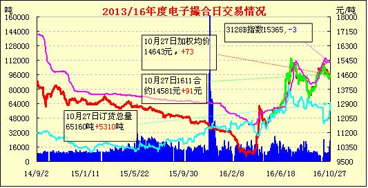10月27日,電子撮合交易成交量增加,均價(jià)全部拉升收漲,MA1701漲幅最大,漲149元/噸,活躍交投主要集中于遠(yuǎn)月合同。10月25、26日,南疆阿克蘇、巴楚等站臺(tái)3128/3129級(jí)手采棉毛重報(bào)價(jià)15500-15700元/噸,3128級(jí)(斷裂比強(qiáng)度低于28CN)皮棉毛重報(bào)價(jià)15200-15400元/噸,但成交比較稀少,內(nèi)地棉紡織廠、經(jīng)營(yíng)商詢價(jià)看貨并不積極。