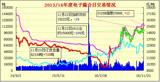 11月23日,電子撮合交易成交量下降,合約均價多數(shù)收跌,活躍交投主要集于中遠(yuǎn)月合同。近期,山東巨野縣棉花企業(yè)看漲棉花價格,開始敞開收購。23日,當(dāng)?shù)刈衙奘召弮r3.95元/斤,衣分率40%,水分13%。另據(jù)了解,部分棉企赴外地采購棉籽,從外省收購的籽棉到廠價格3.90元/斤左右,衣分率39%,水分12%。