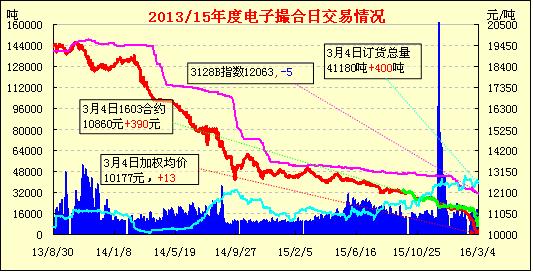 3月4日,電子撮合交易增倉縮量,近月上漲。近月合同均價(jià)與中國棉花價(jià)格指數(shù)價(jià)差擴(kuò)至1208元/噸,價(jià)差較昨日1598元/噸有所縮小。今日交易總量11740元/噸,較昨日減少440噸,訂貨總量41180,增加400噸。近月MA1603合同均價(jià)上漲并首超期貨CF603合約結(jié)算價(jià)。MA1603合同均價(jià)10860元/噸,成交量與均價(jià)上漲,與期貨CF603合約結(jié)算價(jià)10725元/噸,價(jià)差135元,首次超過期貨近月合約結(jié)算價(jià)。訂貨量近減遠(yuǎn)增,當(dāng)日MA1604訂貨量與昨日持平,其余各合同訂貨量為近減遠(yuǎn)增。其中,近月合同MA1603與MA1605訂貨量分別減少310噸、470噸,遠(yuǎn)月MA1606、MA1607、MA1608合同訂貨量均有不同程度增加。增幅最高為MA1607合同,訂貨量增加600噸。當(dāng)前國儲(chǔ)棉輪出政策遲遲沒有明確消息的支撐,現(xiàn)貨市場跌幅趨弱,紡織企業(yè)采購積極性較差,對(duì)市場繼續(xù)持觀望態(tài)度,等待低價(jià)的到來。棉花企業(yè)出貨意愿較為積極,但當(dāng)前高等級(jí)資源量小,價(jià)格相對(duì)較為堅(jiān)挺。