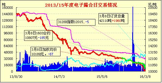 3月8日,電子撮合交易遠月成交繼續(xù)活躍,均價多數(shù)回調(diào)。近月合同均價與鄭棉近月合約價差77元。當日交易量微增,活躍合同集中在遠月,近月成交繼續(xù)謹慎。當日除近月MA1603合同訂貨量減少外,其他合同訂貨均有不同程度的增持?,F(xiàn)貨市場價格相對穩(wěn)定,扎花廠及棉商挺價意愿較強,兵團3128B機采棉內(nèi)地庫報價在12400-12500元/噸,量大有50-100元/噸優(yōu)惠。但下游紡紗廠家等均認為此價相對偏高,購買意向低下。目前南疆阿克蘇等地如籽棉收購價格略高的軋花廠,目前價格銷售已虧損達800-1000元/噸,且銷售遲緩,整體壓力較大。