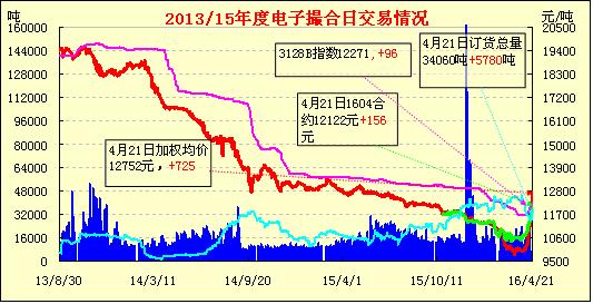 4月21日,電子撮合交易增量上漲,遠(yuǎn)月合同訂貨大增。近月合同均價(jià)與鄭棉近月合約價(jià)差358元。現(xiàn)貨掛牌近月MA1604從4月11日10930元/噸上漲至4月20日11966元/噸,上漲1036元/噸。近期,隨著交易活躍,流動(dòng)性增加,與銷售現(xiàn)貨相比,當(dāng)前價(jià)格具有穩(wěn)健良好的操作機(jī)會(huì)。價(jià)格上行對(duì)賣方銷售提供良好時(shí)機(jī)同時(shí),也為賣方快速批量銷售提供便利。據(jù)了解,庫(kù)存高的紡織企業(yè)并不著急采購(gòu),采購(gòu)報(bào)價(jià)漲幅相對(duì)較小或者并不買現(xiàn)貨價(jià)格會(huì)繼續(xù)上漲的賬;庫(kù)存緊張的紡織企業(yè)采購(gòu)則相對(duì)提價(jià)?,F(xiàn)貨市場(chǎng)上,高等級(jí)棉花提價(jià)比較快,漲幅在200-400元/噸,而低等級(jí)棉花,漲幅則在100-200元/噸左右。目前,江蘇、河南、山東、河北等地全國(guó)棉花交易市場(chǎng)指定監(jiān)管庫(kù)2128C2(3128C2,斷裂比強(qiáng)度28CN以上)、2128B2(3128B2,斷裂比強(qiáng)度28CN以上)級(jí)的棉花毛重報(bào)價(jià)達(dá)到12700-12800元/噸、12900-13200元/噸,較前幾日漲200-300元/噸,但是,送到紡織廠實(shí)際成交價(jià)格低于報(bào)價(jià)100-200元/噸。因此,想要快速批量銷售,可以選擇通過(guò)現(xiàn)貨掛牌上賣出。