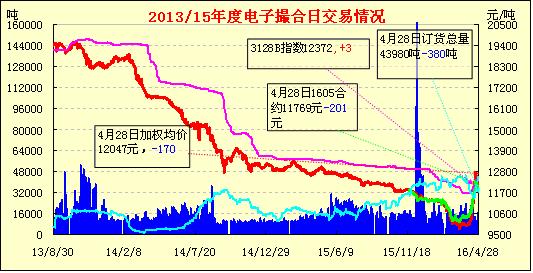 4月28日,電子撮合交易縮量減倉,均價全線回調,盤中交投活躍集中在遠月合同中。近月合同均價與鄭棉近月合約價差461元。當日現(xiàn)貨掛牌交易有以下特點:一、今日成交量大幅減少,近月合同MA1606與遠月合同MA1609、MA1610成交活躍,成交量相對較高。二、訂貨量小幅減少,當日近月、遠期合同出現(xiàn)減持,MA1606與MA1607均出現(xiàn)增持。三、均價全線回調。遠期合同MA1610跌幅趨緩。