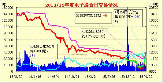 4月29日,電子撮合交易縮量減倉,均價(jià)漲跌互現(xiàn),盤中交投活躍集中在中、遠(yuǎn)月合同中?,F(xiàn)貨掛牌近月合同均價(jià)與鄭棉近月合約價(jià)差323元。當(dāng)日現(xiàn)貨掛牌交易有以下特點(diǎn):成交量繼續(xù)縮減,近月合同MA1605交投較不活躍,中遠(yuǎn)期合同成交量相對較高。訂貨量小幅減少。當(dāng)日遠(yuǎn)期合同MA1610持倉不變,其余各合同均出現(xiàn)減持。均價(jià)漲跌互現(xiàn)。近月合同均價(jià)持穩(wěn),各合同跌幅趨緩。