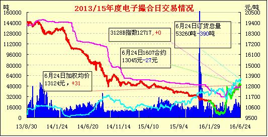 6月24日,電子撮合交易縮量減倉,各合同均價(jià)多數(shù)收漲,盤中交投活躍集中在中、遠(yuǎn)月合同中?,F(xiàn)貨市場(chǎng)延續(xù)堅(jiān)挺局面,儲(chǔ)備棉轉(zhuǎn)售流通占據(jù)主導(dǎo),目前內(nèi)地庫手摘疆棉2128B、3128B價(jià)格在13300-13500元/噸。3128C(2128C)疆棉報(bào)價(jià)在12800-13200元/噸,多數(shù)商家認(rèn)為目前價(jià)格已相對(duì)高位,整體再繼續(xù)上漲空間有限。近期湖北省財(cái)政廳撥付荊門市2015年棉花目標(biāo)價(jià)格改革補(bǔ)貼資金4329萬元。