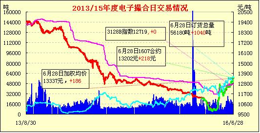 6月28日,電子撮合交易增倉(cāng)縮量,各合同均價(jià)全線收漲,盤(pán)中交投活躍集中在中、遠(yuǎn)月合同中。現(xiàn)貨市場(chǎng)延續(xù)堅(jiān)挺局面,商家報(bào)價(jià)普遍較高,棉花現(xiàn)貨市場(chǎng)報(bào)價(jià)微漲,江浙地區(qū)倉(cāng)庫(kù)疆棉手摘3128BS2級(jí)價(jià)格在13300-13350元/噸公定,貿(mào)易商前期拍儲(chǔ)棉花利潤(rùn)已達(dá)300-500元/噸。進(jìn)口棉現(xiàn)貨資源相對(duì)較少,價(jià)格維持高位,美棉價(jià)格在13500-14000元/噸。隨著輪出投放量的持續(xù)減少,也是形成近期逐步上漲因素。