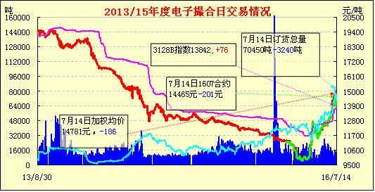 7月14日,電子撮合交易量倉縮量,均價全線下跌,交投活躍集中在中、遠月合同中。外棉到港報價大漲。印度棉Shankar-6 1-5/32報價80.75美分/磅漲3美分,折滑準稅下報價在15070元/噸漲310元,1%配額稅下港口自提報價13610元/噸漲498元。棉花現(xiàn)貨市場價格維持高位,3128B疆棉手摘成交價格在14200-14400元/噸公定,商家讓利空間不大,而高等級手摘疆棉報價在14800-15000元/噸公定,紡企接受高價壓力較大。