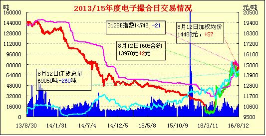 8月12日,電子撮合交易縮量減倉,均價全線收漲,交投活躍集中在近月合同中。現(xiàn)貨市場交投冷清,價格略有陰跌,國儲地產(chǎn)棉報價在13900-14300元/噸,疆棉報價在14200-14800元/噸左右,觀望心態(tài)較為濃重,且廠家也多數(shù)不急于采購,部分直接自己拍儲,呈現(xiàn)有價無市狀態(tài)。