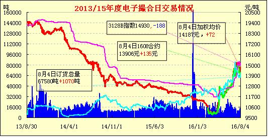 8月4日,電子撮合交易倉(cāng)量齊增,均價(jià)全線上漲,交投活躍集中在近月合同中。據(jù)調(diào)查,5月份以來(lái)疆內(nèi)紡織企業(yè)滌棉、滌粘等混紡紗的產(chǎn)量快速上升,阿克蘇、庫(kù)爾勒、石河子等地很多中小型紗廠“不約而同”的擴(kuò)大滌綸短纖、粘膠短纖的采購(gòu),對(duì)棉花的替代作用不斷增強(qiáng)。一方面疆內(nèi)國(guó)儲(chǔ)棉輪出庫(kù)點(diǎn)少,且運(yùn)輸距離遠(yuǎn),2015/16年度新疆棉現(xiàn)貨價(jià)格5-7月隨鄭期、國(guó)儲(chǔ)棉競(jìng)拍成交價(jià)格的暴漲而一路看漲,明顯超出紡紗、織造企業(yè)的承受能力??紤]到紡C32S及以下支數(shù)棉紗原料成本較高,因此疆內(nèi)企業(yè)大多選擇高支調(diào)配普梳紗、高支精梳紗和混紡紗做為“破冰、生存”的突破口,8月1-3日滌綸短纖價(jià)格已跌破7000元/噸(6995元/噸),不及3128級(jí)棉花的一半;另一方面滌棉混紡紗、滌粘混紡紗與棉紗一樣享受紗線“出疆運(yùn)輸補(bǔ)貼”,混紡紗較內(nèi)地企業(yè)仍有較為明顯的價(jià)格優(yōu)勢(shì),比較受江浙、廣東和山東等地織布企業(yè)、貿(mào)易商的青睞。