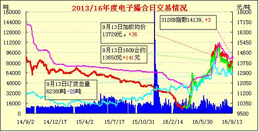 9月13日,電子撮合交易縮量減倉,均價(jià)多數(shù)反彈,交投仍呈現(xiàn)近弱遠(yuǎn)強(qiáng)格局?,F(xiàn)貨市場調(diào)整,整體開秤收購軋花廠增多,北疆奎屯等地少數(shù)手摘棉軋花企業(yè)試收試軋,籽棉收購價(jià)格小漲至6.6-6.8元/公斤衣分40%,目前部分已上市新棉預(yù)售并不理想,主要是前期花質(zhì)量未能吸引中高檔紡紗企業(yè)采購,且低支紗紡企也積極參與儲備棉競拍為主,目前新花與儲備棉差價(jià)達(dá)1200元/噸以上。且部分棉農(nóng)也不急于交售籽棉,大部分存棉待售心態(tài)較濃。