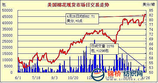 錦橋紡織網(wǎng)—資訊頻道> 棉花信息> 美棉現(xiàn)貨>正文 美國棉花現(xiàn)貨市場(chǎng)行情(4-26)