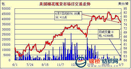 錦橋紡織網(wǎng)—資訊頻道> 棉花信息> 美棉現(xiàn)貨>正文 美國棉花現(xiàn)貨市場行情(6-7)