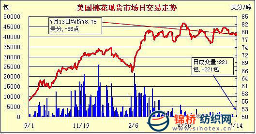 錦橋紡織網(wǎng)—資訊頻道> 棉花信息> 美棉現(xiàn)貨>正文 美國棉花現(xiàn)貨市場行情(7-14)