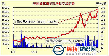 錦橋紡織網(wǎng)—資訊頻道> 棉花信息> 美棉現(xiàn)貨>正文 美國棉花現(xiàn)貨市場行情(11-1-27)