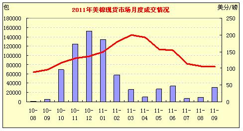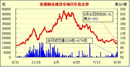 美元走強(qiáng),紐約期棉全線下滑,美現(xiàn)貨市場量縮價跌,七大市場均價99.01美分/磅,跌203點。其中東得克薩斯州跌200點,成交1219包,較昨日減少4062包?;仡櫧鼉蓚€月美棉現(xiàn)貨市場,總體表現(xiàn)平穩(wěn),9月份標(biāo)準(zhǔn)級成交均價105.42美分/磅,比8月份106.4美分微跌98點。由于價格逐步趨于平穩(wěn),成交放量,9月份總成交3.12萬手,比8月份增加2.15萬手。