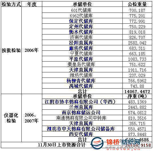 11月30日計(jì)劃拋售2006、2007年度儲(chǔ)備棉20159噸,以下為拋儲(chǔ)庫點(diǎn)拋售情況及詳細(xì)拋儲(chǔ)數(shù)據(jù):
