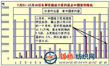 11月來,中國進口美棉速度明顯加快,截止至12月10日的一個月來,簽約美陸地棉10.71萬噸,是去年同期的3.5倍,占美棉出口簽約總量的41.5%,同比提高24.4個百分點。