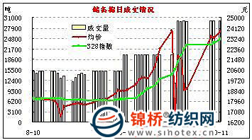 10月11日儲備棉投放數(shù)量30060噸,歷時約十二個半小時全部成交。平均等級3.94,與9日持平,平均長度28.41,較9日高0.02,加權(quán)均價23843元/噸,較9日漲546元/噸,折328級成交價為24415元/噸,較9日漲549元/噸。 當(dāng)日交易的主要特點(diǎn):