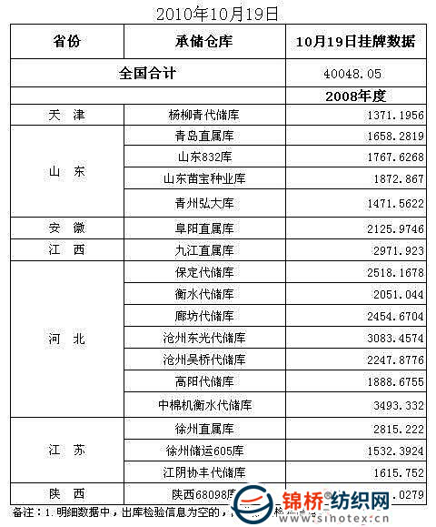 各紡織用棉企業(yè): 10月19日計劃投放儲備棉40048.05噸,以下為投放庫點具體數(shù)據(jù)情況: