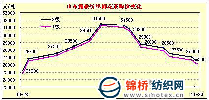 繼11月23日山東某大型紡織企業(yè)皮棉采購價格下調(diào)500元/噸后,11月24日,該集團繼續(xù)下調(diào)皮棉采購價,目前3級皮棉采購價格為26500元/噸(送到、帶票、公重、現(xiàn)款,下同),4級價格為26100元/噸,5級價格為23100元/噸。這是自11月中旬來連續(xù)第八次下調(diào)采購價。